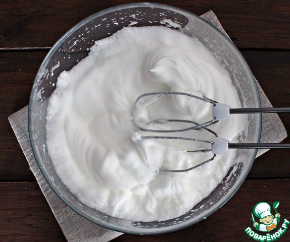 К 4-м белкам добавляем белок, оставшийся от приготовления песочного теста. Взбиваем их в стойкую, пышную пену. Половину выкладываем в маковую начинку, 2-ю половину в творожную. Аккуратно перемешиваем обе начинки.