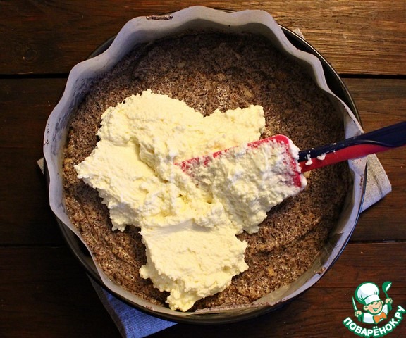 На песочный корж равномерно распределяем маковую начинку. Поверхность начинки разравниваем. -