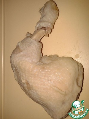 • Куриный окорок почистить и нарезать кубиками. Салат будет слоями и это будет 1-й слой. Промазать майонезом. Можно посолить. Я для красоты выложила в бокал, но лучше в салатник.