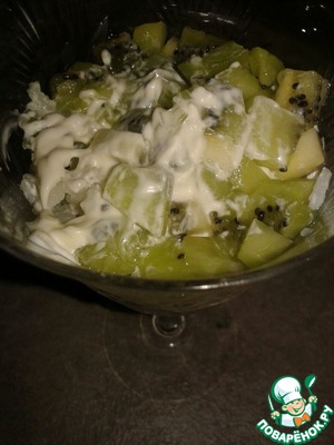 • 3-й слой порезать кубиками очищенный киви, выложить в емкость и промазать майонезом