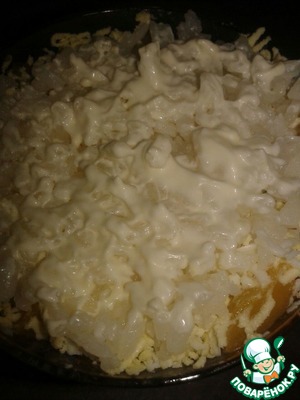 • 2-й слой выложить половину риса и промазать майонезом. Рис у меня при варке получился достаточно соленый.