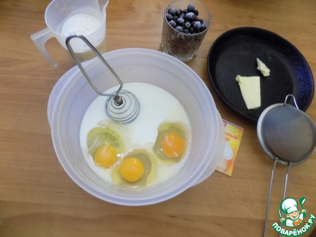 Молоко нужно подогреть и вылить в посуду, где и будем делать тесто. Добавляем в молоко ванильный сахар и соль. Венчиком соединяем. Ягодам даём оттаять.