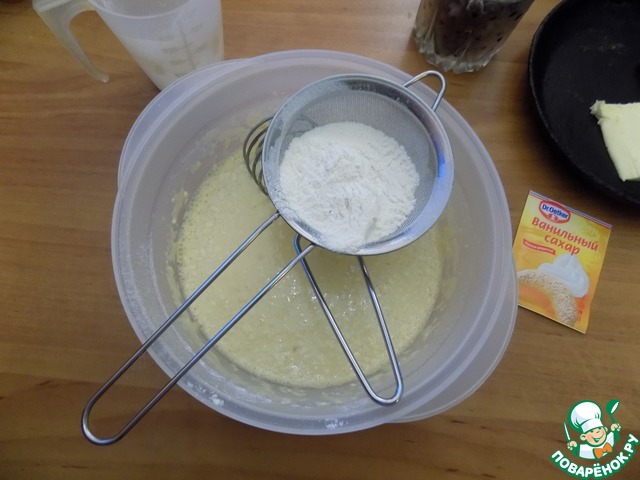 Просеиваем понемногу муку и соединяем с яично-молочной смесью.