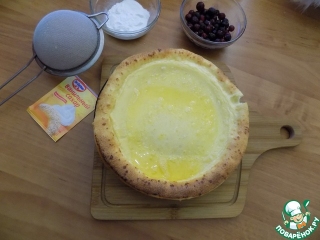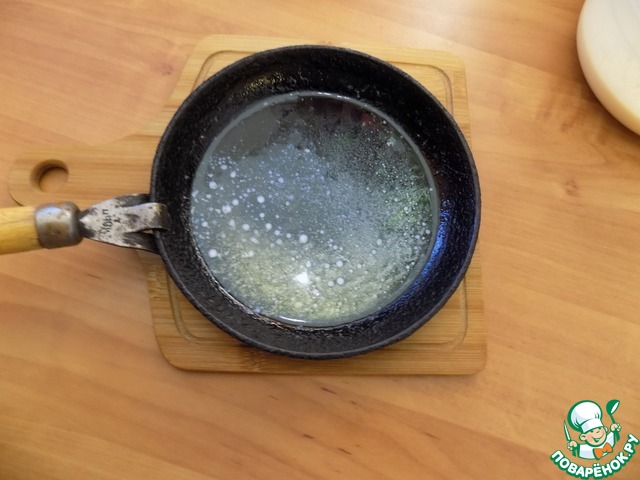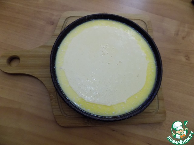 Я выпекала на старинной чугунной сковороде. Выложила на сковороду масла 1 ст л и поставила в духовку растопиться. Сковороду с растопленным маслом вынула из духовки.