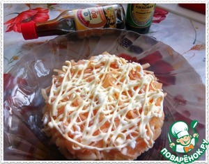 Теперь на сырный слой выкладываем маринованный лук и его покрываем легкой майонезной сеткой.