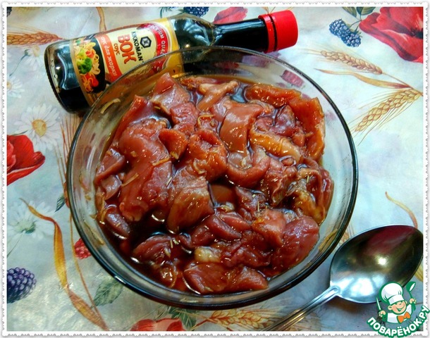 • В маринад добавляем кусочки индейки, хорошо перемешиваем, отставляем в сторону минимум на 30 минут. В это время займемся другими ингредиентами.