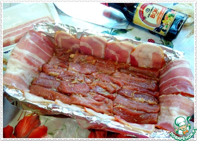 • Для праздничного вида и аромата копченостей выстилаем форму полосками сырокопченого бекона. Если бекон не употребляете, то можно просто форму смазать маслом, так блюдо выйдет не только праздничным, но и диетичным!