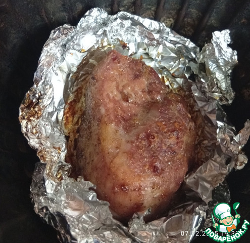 По истечении времени достаем наше уже ароматное мясо и герметически заворачиваем в фольгу, сберегая этим вкус, аромат и сохраняя максимум полезных веществ и отправляем в разогретую до 180 градусов духовку на 1 -1.5 час. (ориентируемся по своей духовке). Затем аккуратно вскрываем верх фольги, освобождая мясо. Проверяем готовность, делая прокол (если выделившийся сок прозрачный мясо готово) и продолжаем запекать открытым до зарумянивания. Румяное, красивое мясо достаем из духовки, опять заворачиваем в фольгу и даем постоять 20 мин.