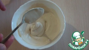 Приготовим соус. Для него смешаем сметану с натёртым чесноком, добавим соевый соус (лёгкий соус ТМ Kikkoman)