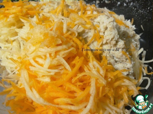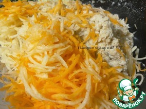 3. Добавить измельчённые овощи. Морковь и тыква натёрты на средней тёрке. Перемешать.