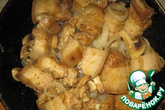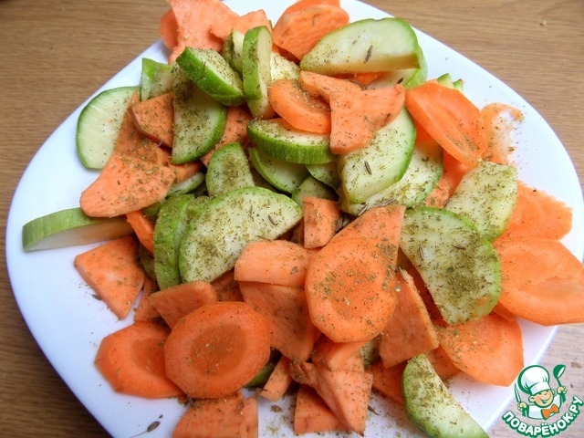 Оставить мясо пропитаться в холодильнике на несколько часов или на ночь, накрыв плёнкой. Овощи пересыпать тмином и хмели-сунели тоже, посолить.