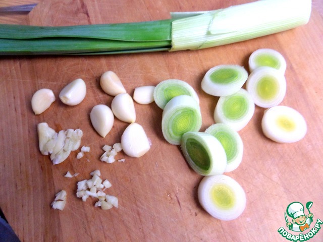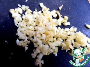 Чеснок раздавить рукояткой ножа и измельчить ножом.