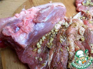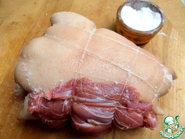 Сделать примерно 3 прокола вверху и запекать 1 ч 15-20 минут при 180*. Если рулька крупная, то 1,5 часа.