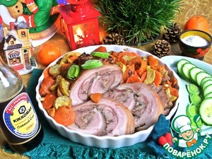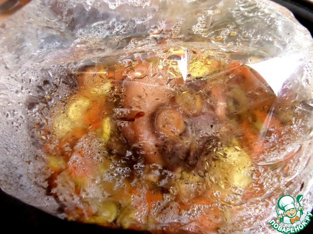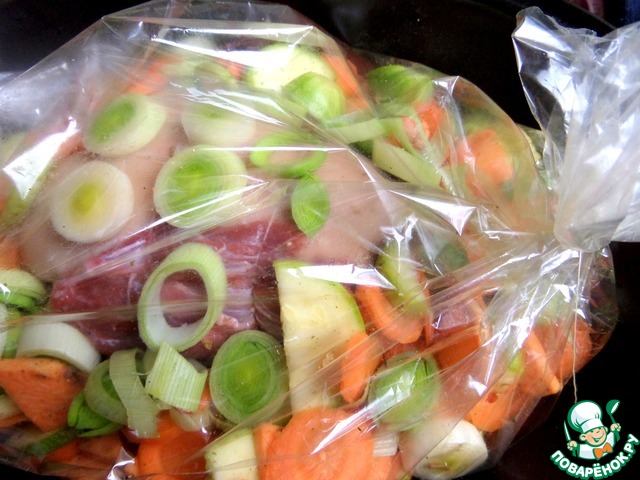 Поместить пропитанную рульку в центр рукава, вокруг рассыпать подготовленные овощи.