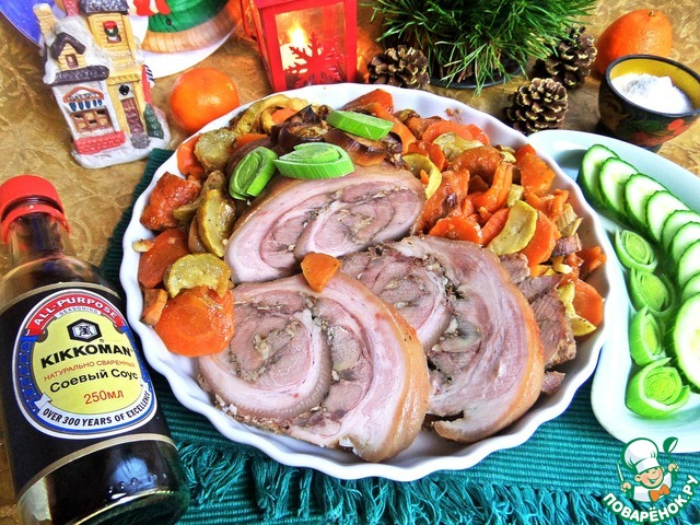 Уютное мясное блюдо. Можно подавать сразу из духовки в горячем виде или дать остыть и использовать рулет из рульки в качестве мясной нарезки на закуску. Также подходит в сочетании с квашеной тушёной капустой.