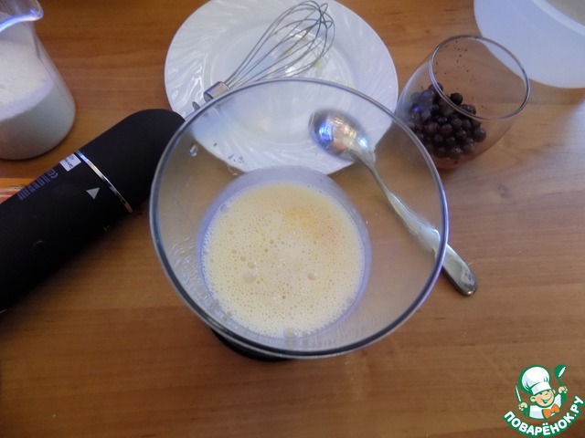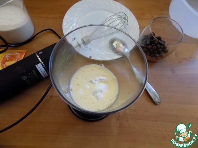 • Сливочное масло растапливаем и даём немного остыть. Яйцо взбиваем и добавляем сахар, доводим до густой пены.