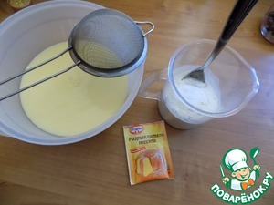 • Муку соединяем с разрыхлителем. Сливочно-сметанную смесь помещаем в посуду, где будем делать тесто. Просеиваем муку перемешанную с разрыхлителем понемногу.