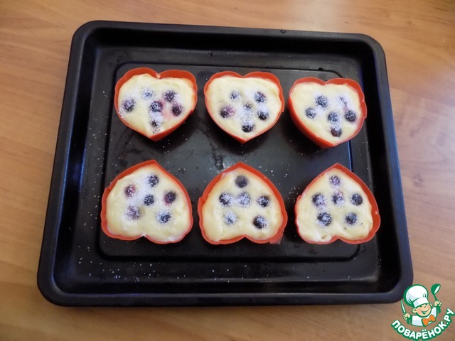 • Замешиваем тесто. Берём формочки. Я взяла силиконовые и распределяем тесто по формам. Выкладываем высотой на 2/3 форм. Размороженную смородину нужно обсушить от влаги и вдавить ягоды сверху в тесто. Присыпать сверху кексы сахаром немного. Ставим выпекаться в разогретую духовку до т-180 С на 15 минут. Ориентируйтесь по своей духовке.