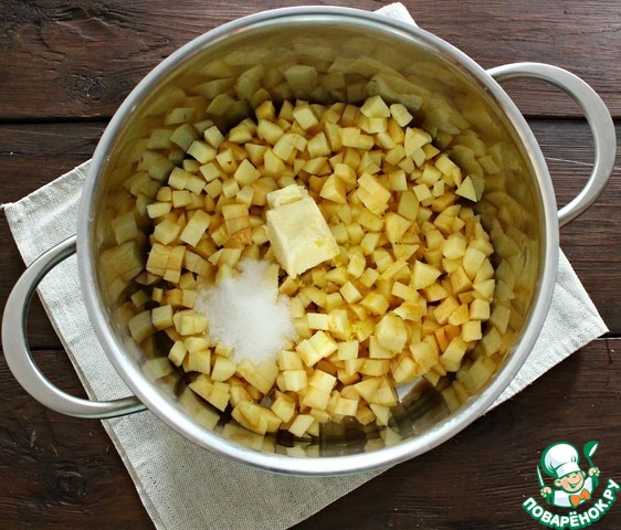Пока тесто в холодильнике, начинаем готовить начинку. Яблоки очищаем от кожуры и сердцевины. Режем мелкими кубиками. В кастрюлю с толстым дном выкладываем сливочное масло, нарезанные яблоки, сахар (количество сахара регулируйте в зависимости от сладости яблок). Добавляем сок и цедру лимона. Аккуратно перемешиваем, ставим на самый маленький огонь. Как только масло растопится, накрываем крышкой кастрюлю. Тушим яблоки до средней мягкости.