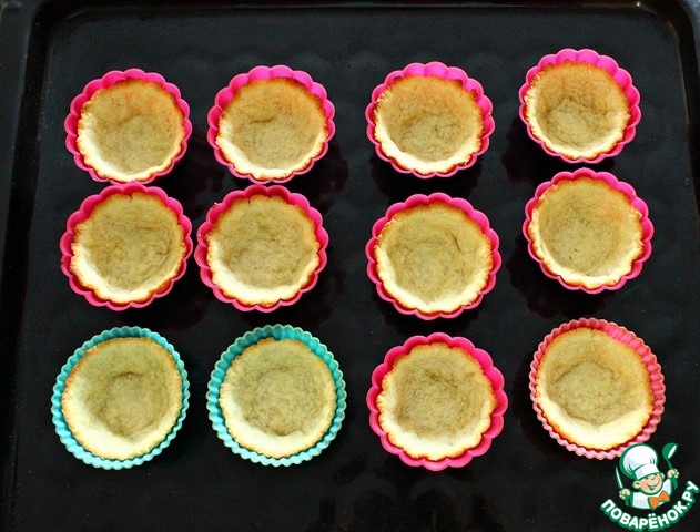 Тесто делим на 12 равных по весу кусочков. Каждый кусочек расплющиваем руками в лепешку, немного больше, чем сама формочка. Вкладываем лепешку в силиконовую формочку и тщательно прижимаем тесто по дну и боковинам. Таким образом, заполняем все силиконовые формочки. Помещаем их в морозильную камеру на 15 минут. Это нужно для того, чтобы они во время выпечки не потеряли форму.