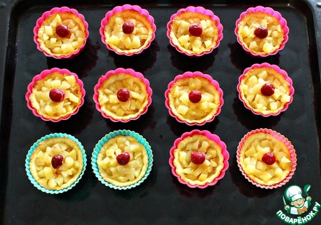 В корзиночки раскладываем яблочную начинку, немного утрамбовываем. В каждую корзиночку выкладываем по ягодке. У меня замороженная вишня (без косточки). Предварительно ягоду размораживать не надо.