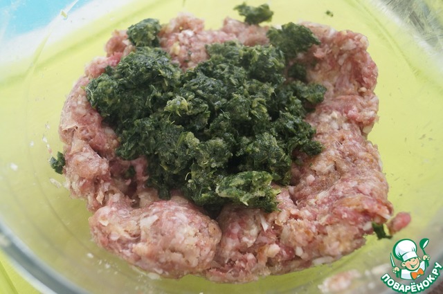 • Размороженный шпинат слегка отжать и добавить к фаршу. Снова все хорошо перемешать.
