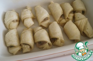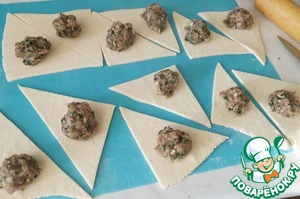 • Слоеное тесто раскатать в тонкий пласт и нарезать треугольниками. Выложить на каждый кусочек немного мясного фарша со шпинатом.