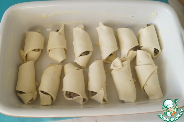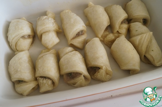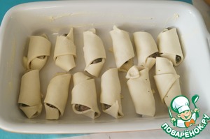 • Свернуть тесто с начинкой рулетиками. Форму для запекания смазать сливочным маслом и выложить на небольшом расстоянии круассаны. Поставить в разогретую до 180 градусов духовку, на 10-15 минут, до легкого зарумянивания.