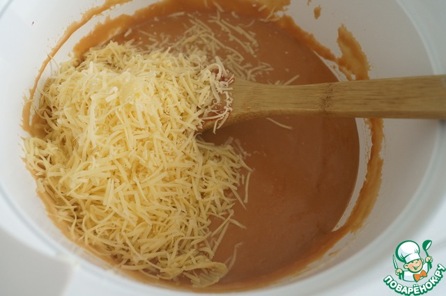 • Добавить томатную пасту и тщательно перемешать, чтобы она полностью распределилась по всему соусу. Добавить тертый сыр и готовить до полного его расплавления. Снять массу с огня.