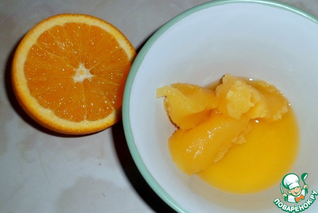 Выдавить из апельсина сок, добавить густой мед, хорошо растереть вилкой. Если мед жидкий, тогда стоит отказаться от апельсинового сока.
