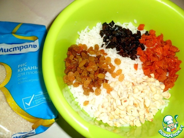 Когда рис ТМ Мистраль полностью остынет, добавить к нему изюм, чернослив, курагу и орехи. Хорошо перемешать, чтобы все распределилось равномерно. Не месить, чтобы рис не потерял целостность.