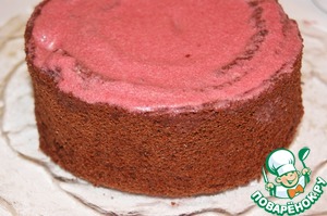 Ровным слоем нанести 4 ст. л. мусса на дно блюда по центру, сверху поместить торт. Одеть кольцо так, чтобы от края по всему кругу осталось расстояние 1,5 см. Равномерно залить весь оставшийся мусс и поместить торт в морозильную камеру на 1 час.