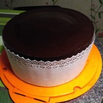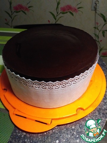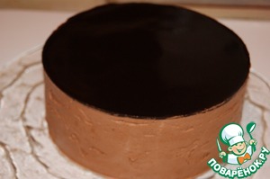 Достать форму с тортом из холодильника и вылить глазурь в центр. Наклоняя форму в разные стороны дать глазури равномерно распределиться по поверхности. Делаем все быстро, потому что на холодной поверхности торта глазурь быстро застывает.