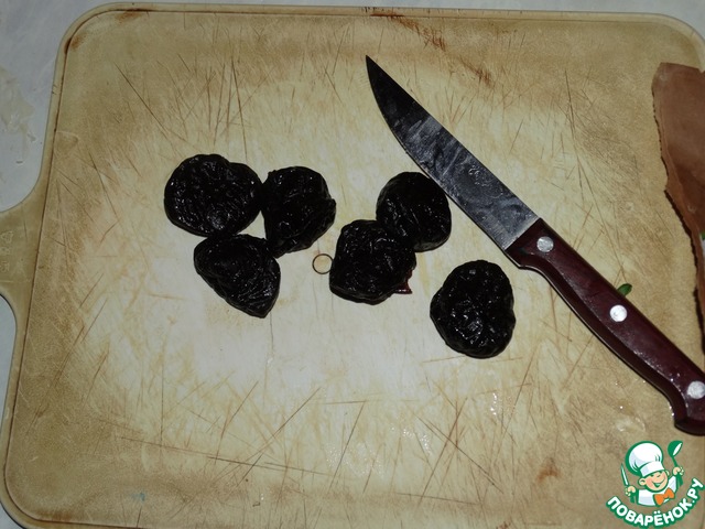 Чернослив нужно предварительно промыть и размочить в кипятке. Нарезаем его очень мелко.
