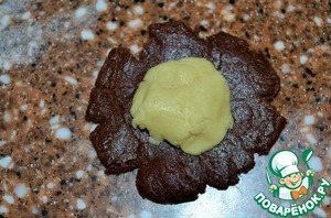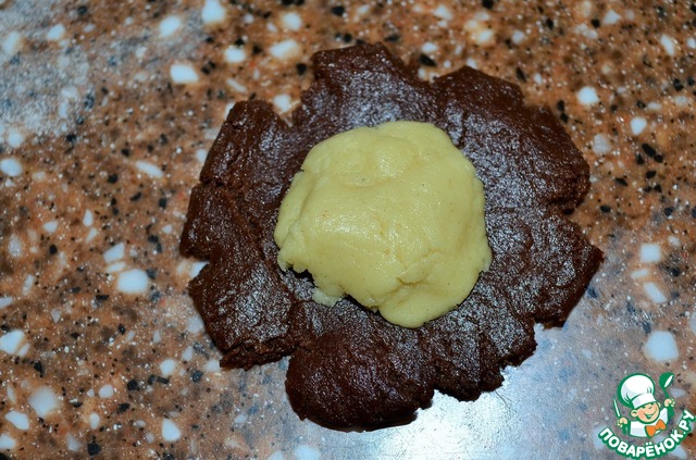 Отщипнуть 20 г. ( с грецкий орех) шоколадного теста, расплющить и