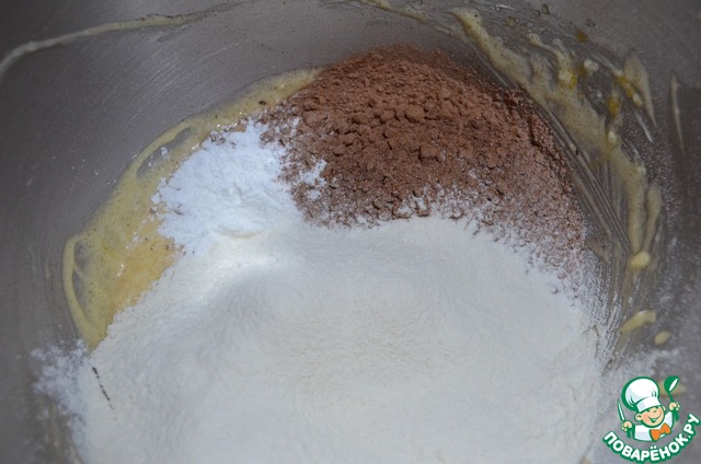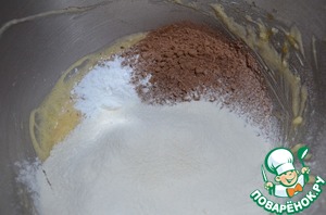 Во вторую часть добавить какао-порошок, муку и разрыхлитель.