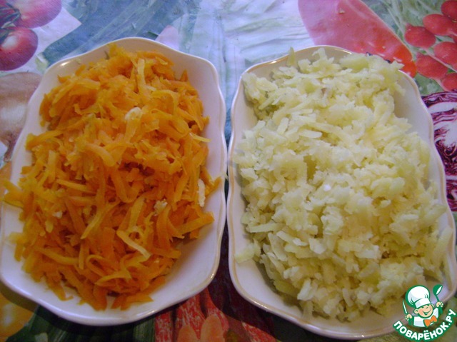 Сваренный в "мундире" картофель и отварную морковь остудить и натереть на крупной тёрке