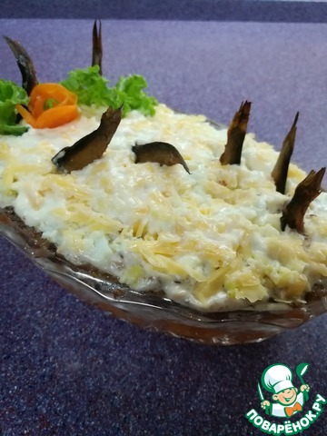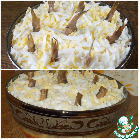 Затем покрываем сыром. Более обильно смазываем майонезом. После этого берём шпротные хвостики и вставляем вертикально в салат.
