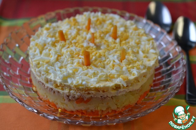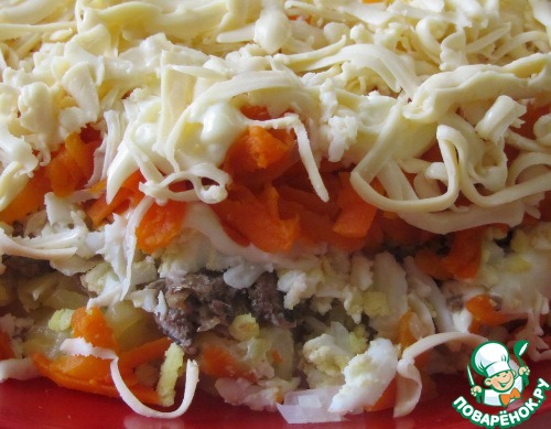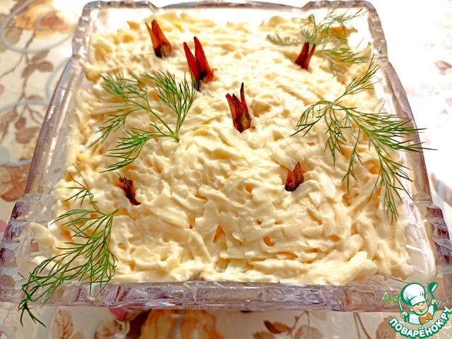 Первый слой - это морковка. Сверху нанести майонезную сеточку -