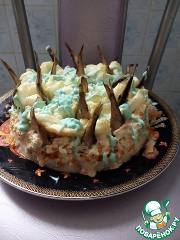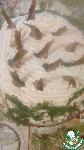 [+5]Очень, очень вкусный салатик-пруд получился! Только мои хвостики-рыбки уплыли в рот акуле...муж заглянул на кухню! Ну что тут пожелаешь???? Пришлось морковку поставить. А может это у меня рыбки модные, крашеные!!!