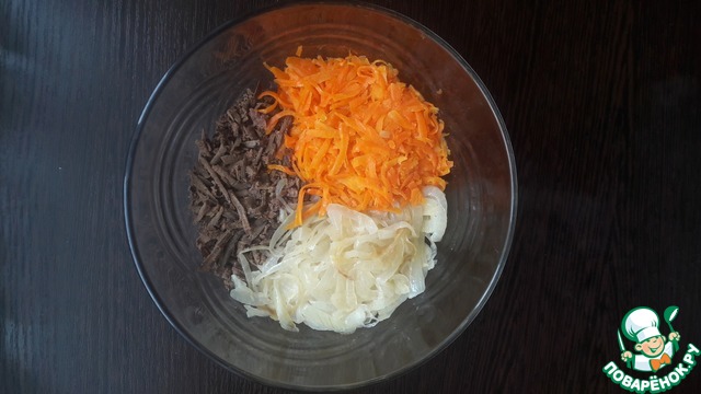 Морковь так же натераем на крупной тёрке и, вместе с нарезанным полукольцами луком, пассеруем. Соединяем лук и морковь с печенью. -