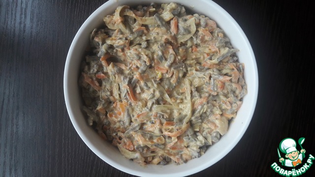 Очень вкусный салат для всей семьи! С приятным чесночным вкусом. Время готовки ( с учётом варки печени) 1час.