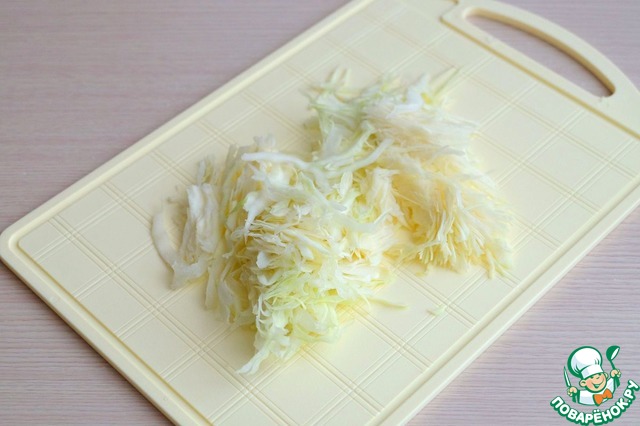 Свежую капусту (600 гр.) нашинковать мелкой соломкой (можно воспользоваться теркой-шинковкой).