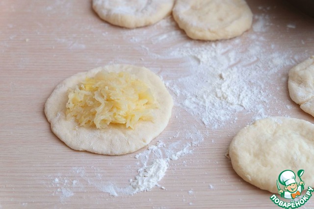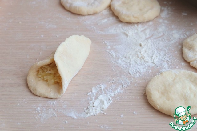 Тесто разделать на равные кусочки, сформовать круглые лепешки, выложить на середину начинку из капусты.