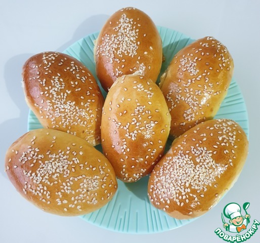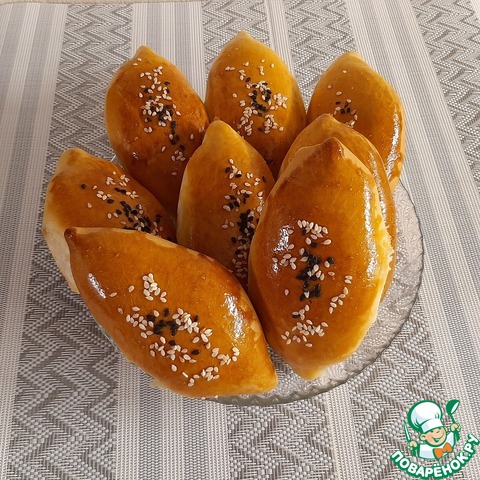 Пирожки выложить на противень, застланный пекарской бумагой. Дать пирожкам расстояться в течение 10-15 мин. Затем смазать пирожки взбитым яйцом, посыпать белым и черным кунжутом и отправить в разогретый до