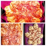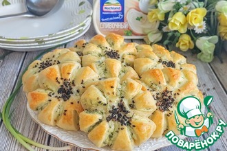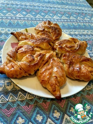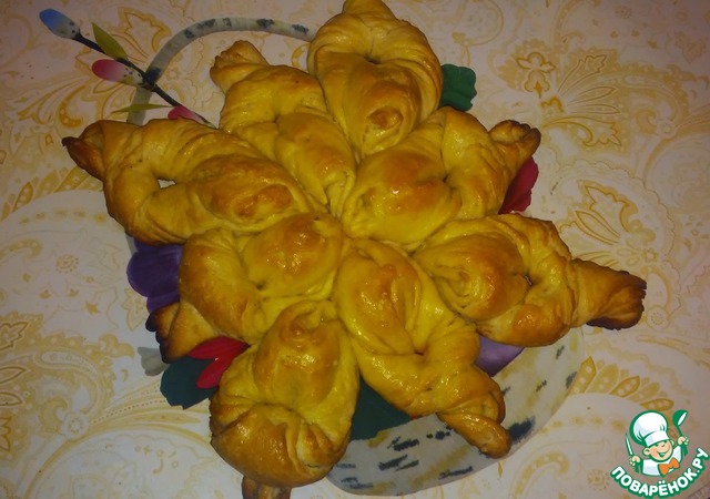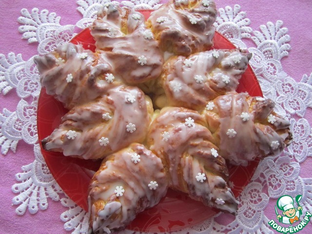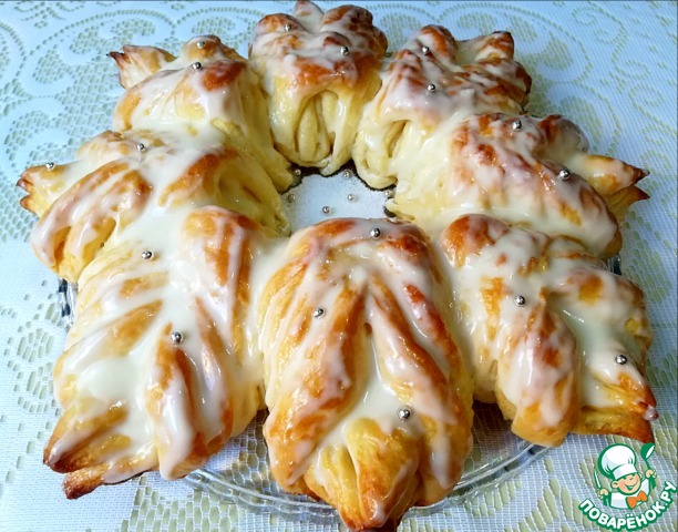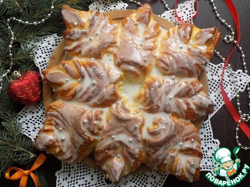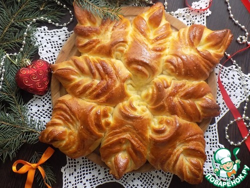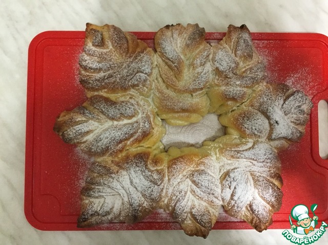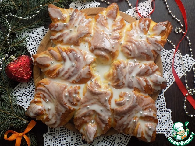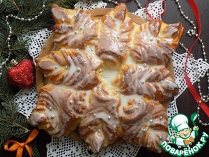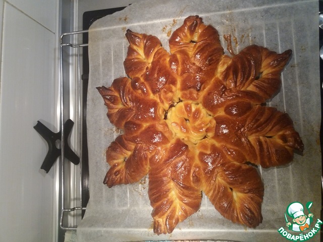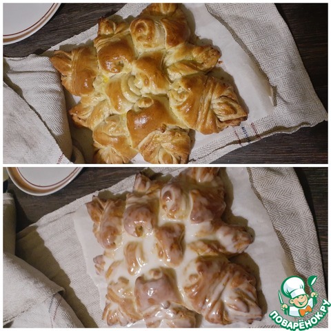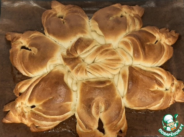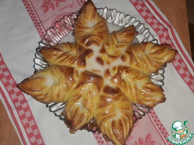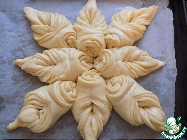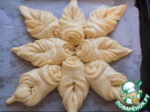 Выкладываем их на противень в форме снежинки, стараемся, чтобы было видно каждый слой, чуть отделяем их друг от друга при необходимости.