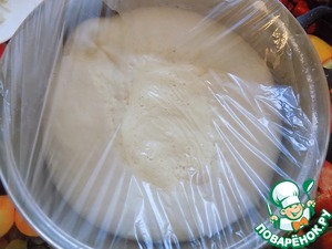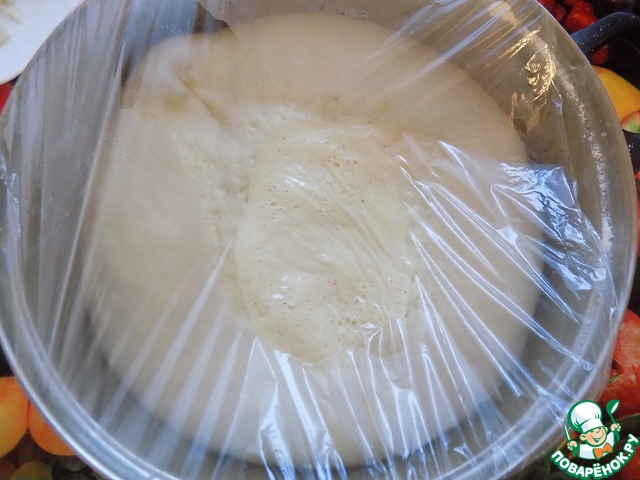 Накрываем посуду с тестом пищевой пленкой и ставим в теплое место подходить на 1-1.5 часа. Тесто должно увеличиться в объеме в 2-3 раза.