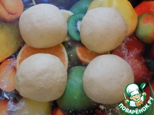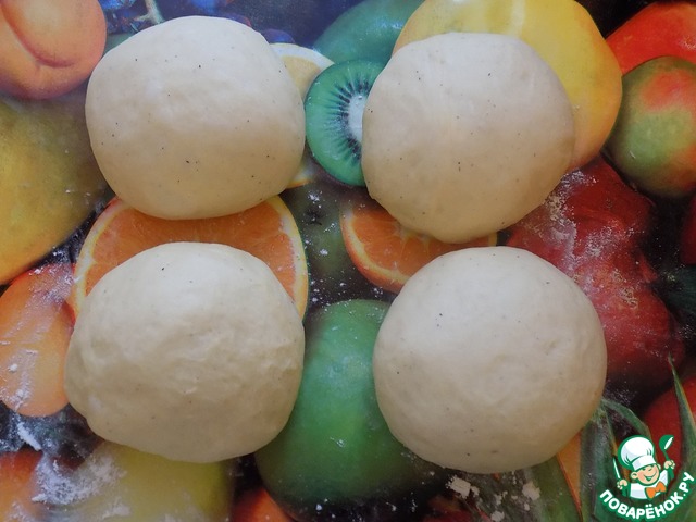 Обминаем подошедшее тесто и делим его на 4 равные части, каждую подкатываем в колобок.