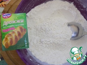 Половину от всего количества муки просеиваем и смешиваем с дрожжами. У меня очень качественные сухие дрожжи ''Dr. Oetker".