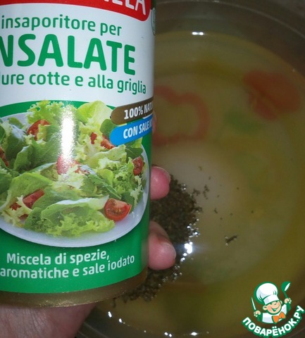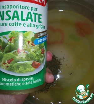 • Из апельсина выдавить сок (около 100 мл), добавить белое вино, соль и специи. Можете выбрать любые свои любимые специи. Но к этому блюду я рекомендую использовать мяту, орегано, паприку, лимонный перец. Все они входят в состав этой ароматной соли для салатов, которую мне привезла в подарок подруга из Италии.